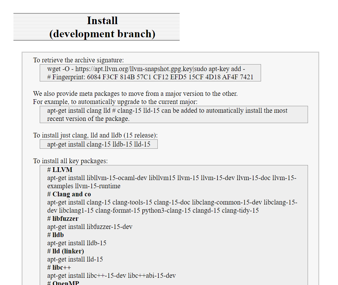 Trying things out manually on a plain vanilla Ubuntu 20.04 I find … it doesn’t know from llvm-15. Or clang-15. Etc. (After properly setting up apt with the LLVM package repository, of course.) After quite a bit of investigation I find … nothing really. No blog post about it anywhere that DuckDuckGo knows about, etc.